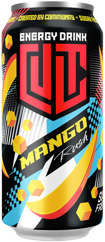 Cult Mango Rush on herkullinen mangon makuinen, sokeriton energiajuoma, joka sisältää kofeiinia ja B‐vitamiineja.